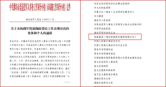 近日,潍坊市委退役军人事务工作领导小组(市双拥工作领导小组)印发《关于表扬拥军优属拥政爱民工作表现突出的集体和个人的通报》,对一批双拥模范典型进行通报表扬。集团所属昌威集团荣获拥军优属拥政爱民工作表现突出集体称号。