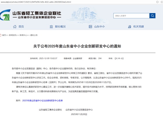 近日,经企业申报、资料审核、专家评定等一系列严格程序,潍坊市昌威交通工程有限公司研发中心被山东省轻工集体企业联社、山东省中小企业发展促进中心联合认定为2025年度山东省中小企业创新研发中心,标志着昌威交通工程公司在号牌智能制造领域的技术创新能力获得省级层面的权威认可。
