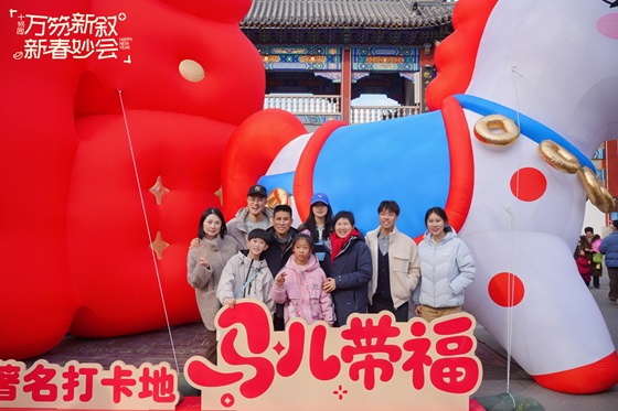 作为本届庙会的视觉亮点,新型软质花灯的运用让古韵街区焕发时尚生机。南门入口处高达6至8米的巨型发光花灯“马儿带福”,凭借时尚可爱的造型和绚丽的灯光效果,被无数市民游客拍照上传社交媒体,自发传播为网络热梗,成为今年春节潍坊最具人气的打卡点之一。中心广场的巨型生肖主题花灯气势恢宏,“妙梦长廊”以梦为马的设计理念,屋顶与外立面的发光装饰与马年生肖挂件营造出沉浸式光影通道;关帝庙西广场至北街区域的定制打卡点与小舞台演出相映成趣;潮流感十足的互动花灯装置散落街区,让拍照打卡成为逛庙会的“标配”。