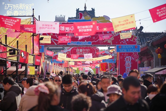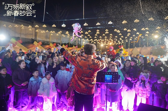 沉浸式演出每日轮番上演,流行歌曲、相声、魔术表演接连登台,穿插“马年互动游戏”邀请市民与本地文艺团体同台献艺,台上台下欢笑不断。20人NPC队伍身着清明上河园同款发光玩偶服,沿主街区巡游派发新春小礼品,所到之处无不掀起合影热潮。