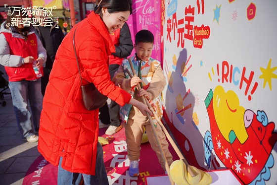 “踏福生财”“趣猜灯谜”“夹个元宝”“冰壶闹新春”等趣味游戏区人气爆棚,亲子家庭与年轻群体在游戏中感受浓浓年味。