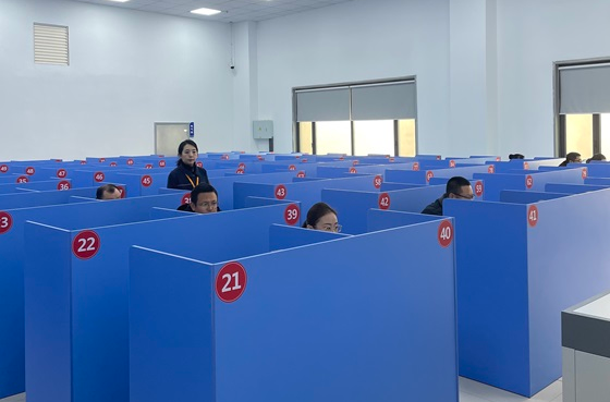考试全程严格落实考务规范,入场环节设立“人证核验、电子设备智能存取、签到登记”三重关卡,严把流程关,筑牢考试公平第一道防线。考场内全部为独立隔断式考位,并配备有专属考试设备与全方位高清监控,监考人员全程动态巡查,确保考试过程公平公正、可追溯、零差错。考生专注作答,考场秩序井然。